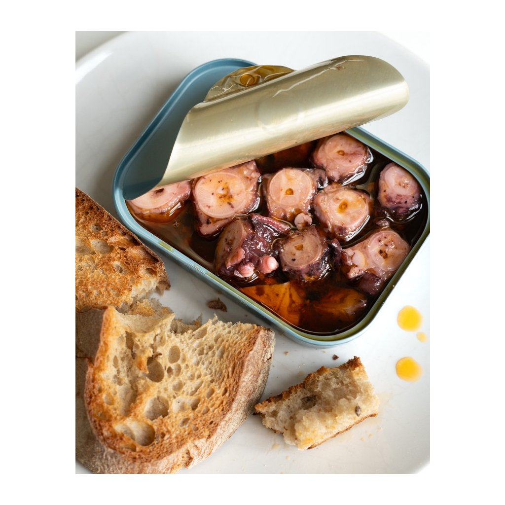 Kvalitní chobotnice v extra panenském olivovém oleji, sůl a především uzená paprika z La Vera, regionu známého svou specifickou metodou sušení papriky nad kouřem, která jí dodává intenzivní kouřovou chuť.