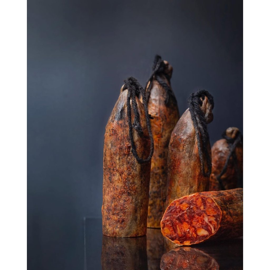 Pochází z černých iberských prasat, která se volně pohybují v dubových hájích a živí se hlavně žaludy (bellotas). Díky tomu a aromatickým bylinám, jako je rozmarýn či tymián, je chorizo výjimečně voňavé, jemné a chuťově bohaté – s dokonale vyváženou kombinací uzené papriky, iberského masa a přirozeně zdravých nenasycených tuků.
