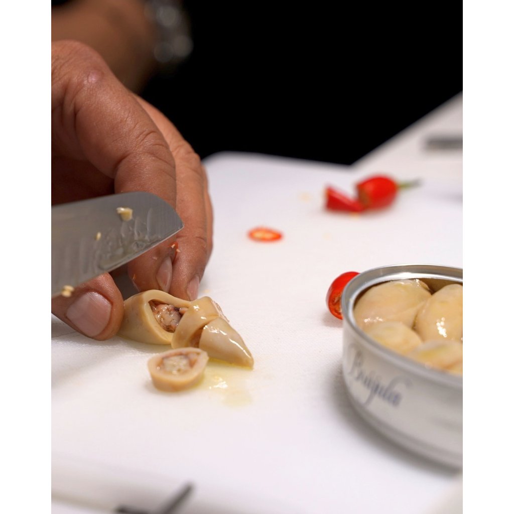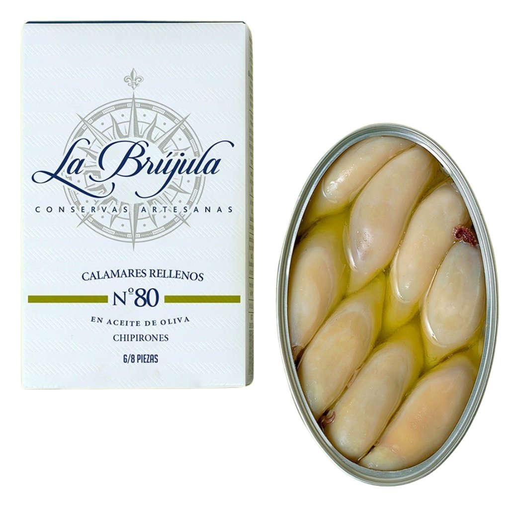 Lahodné malé kalamáry nakládané v olivovém oleji, díky čemuž vynikne jemná chuť masa. Po ručním výlovu se vyberou ty nejmenší kusy, ručně se očistí, naplní vlastními chapadly a naloží do olivového oleje. Tím vzniká chutná delikatesa, která překvapí svou příjemnou pevnou texturou. Kalamáry jsou výtečné jako součást předkrmů, těstovinových pokrmů nebo do paelly. La Brújula je jedna z nejprestižnějších španělských firem zpracovávajících mořské plody, a to především díky nejnovějším technologiím, kvalitním surovinám a tradičním recepturám. La Brújula vybírá pouze nejkvalitnější suroviny z galicijských zálivů a Kantanbrijského moře. Nepoužívají konzervační látky, barviva nebo bělidla a dodržují přísné kontroly kvality během výrobního procesu. Hmotnost: 110 g (6-8 ks) Původ: Španělsko Jsme přímým dovozcem tohoto produktu.