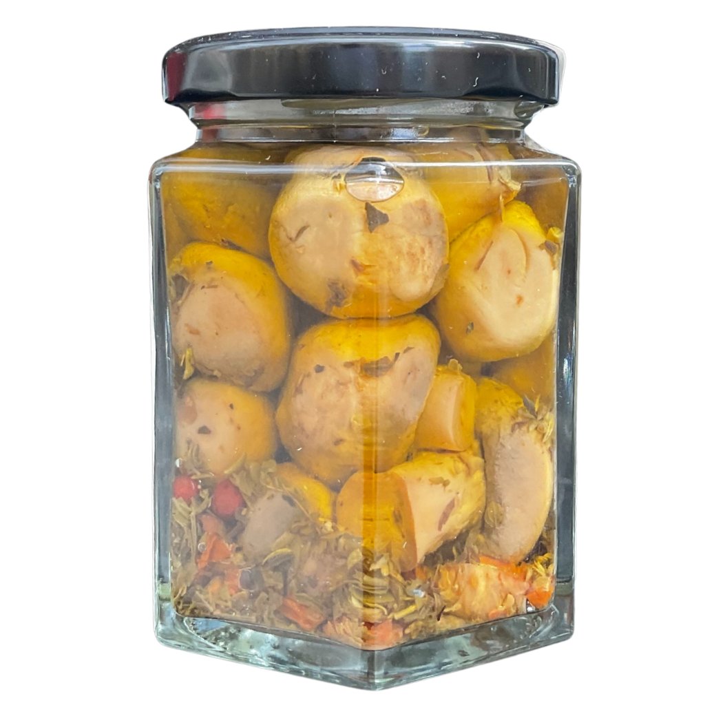 Tyto pečlivě vybrané houby jsou ručně sbírané a naložené v jemném nálevu z kvalitního olivového oleje, česneku, bylinek a vinného octa. Díky šetrné přípravě si žampiony zachovávají pevnou strukturu, svěží chuť a výrazné aroma.